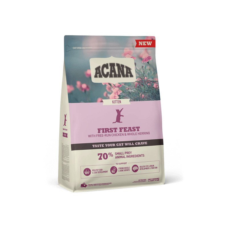 Kassipoja elu täisväärtuslikuks alguseks. Edukaks kasvuks ja arenguks. Acana First Feast sisaldab rohkelt vabapidamisel kasvatatud kana ja toorest heeringat.
