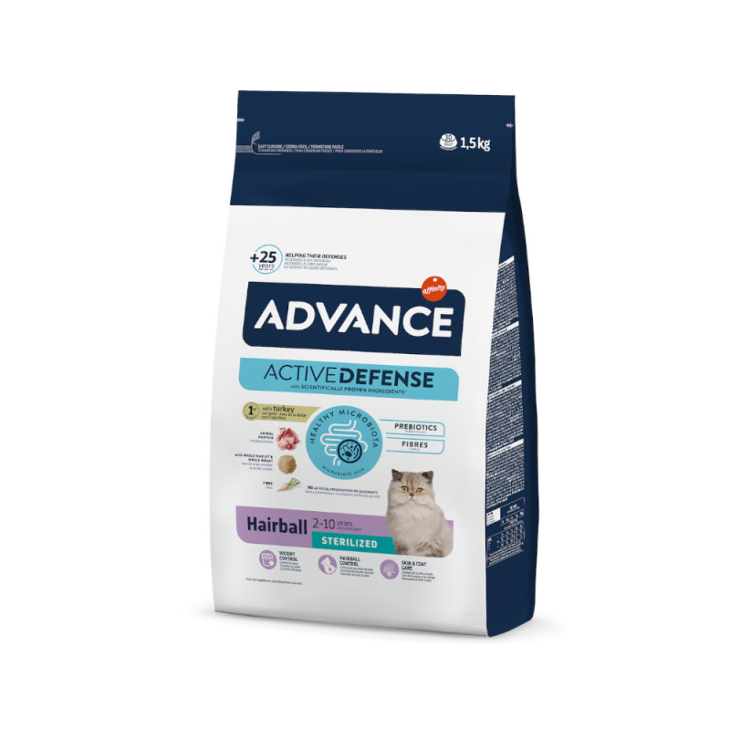ADVANCE HAIRBALL STERILIZED on tänu oma unikaalsele koostisele mõeldud kassidele, kellel on kalduvus regulaarsele karvapallide moodustumisele. Tänu looduslike kiudude, sealhulgas kaera ja rohelise herne kiudude ning linnaseekstrakti segule aitab toode karvapallide teket vältida.
