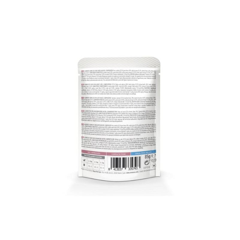 Vastupandamatult maitsev Amanova Grain Free Adult Cat Salmon & Turkey on esmaklassiline toitaineterikas kassi märgtoit. Konserv on teraviljavaba ja selle valmistamisel on kasutatud vaid kõrgeima kvaliteediga värsket lõhe ja kalkunit. Märgtoidule on lisatud ka mineraalide poolest rikast pruunvetikat selle kasulikkuse ja maitse tõttu. Et hoida teie kassist sõpra tugeva tervise juures, on Amanova konservis C-, D3- ja E-vitamiini ning kelaaditud mineraale, mis parandavad nende toitainete omastamist. Toode sisaldab ka looduslikku tauriini südame ja silmade tervise jaoks. Maitsva ja toitvana on see ideaalne igapäevane toit tervele ja rahulolevalt nurruvale kassile.