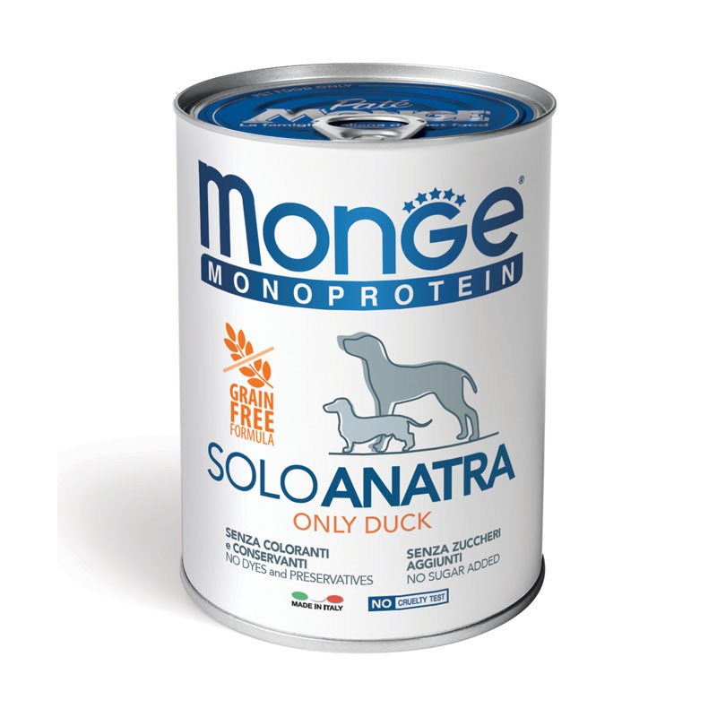 Monge ühevalguline konservtoit igat tõugu täiskasvanud koertele. See sisaldab ainult ühte tüüpi kõrgeima kvaliteediga liha - pardi. Ei sisalda teravilja.