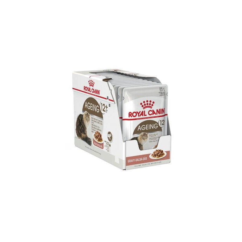 Royal Canin Ageing 12+ in Gravy tasakaalustatud täissööt kastmes eakatele kassidele alates 12. eluaastast. Eakas kass vajab kvaliteetset ja kergesti seeditavat toitu, et aidata tal toime tulla vanusega kaasnevate probleemidega. Et toetada Sinu kassi tervislikku vananemist, sisaldab Ageing 12+ patenteeritud antioksüdantide kompleksi ja EPA/DHA rasvhappeid.