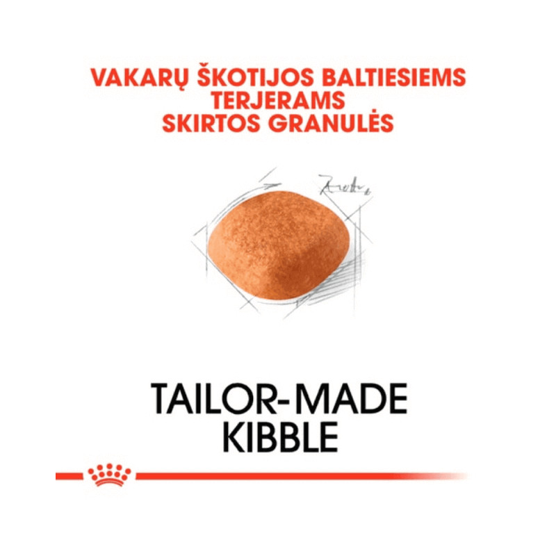 Royal Canin West Highland White Terrier Adult on kuivtoit täiskasvanud West Highlandi terjeritele alates 10. elukuust. West Highlandi terjeritel on kare karvkate ja pehme nahk. Hoolikalt valitud koostisained aitavad säilitada särava, valge ja läikiva karvkatte ning terve naha.