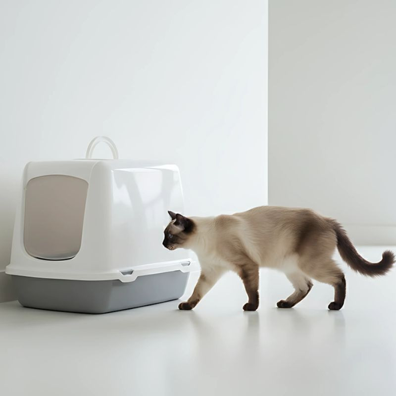 Klassikaline suletud liivakast kassile ukse ja vahetatavate filtritega.